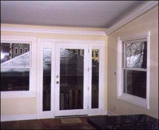 | We cut the opening and installed the full glass door along with full height glass sidelights, which opened up great views of the back yard. | |
